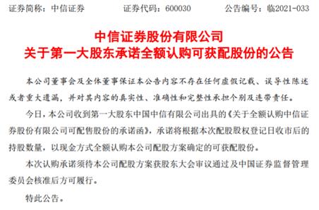 6月28日,中信证券公告称,中国中信承诺将根据本次配股股权登记日收市后的持股数量,以现金方式全额认购本公司配股方案确定的可获配股份。