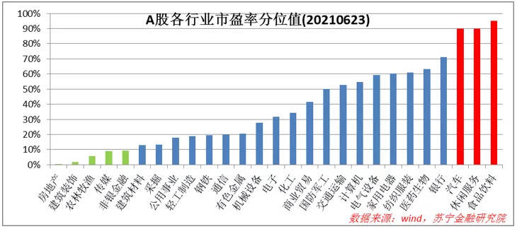2021年6月23日,房地产(0.2%)、建筑装饰(1.7%)、农林牧渔(5.9%)、传媒(9%)、非银金融(9.4%)五个行业的市盈率分位值均低于10%,同时食品饮料(95.1%)、休闲服务(89.7%)、汽车(89.7%)三个行业的市盈率分位值处在90%左右,出现明显的两极分化。