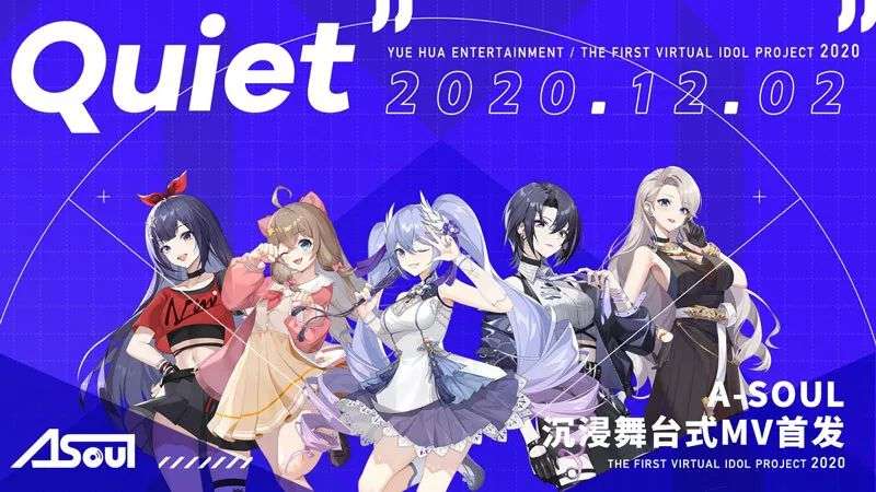 涉足虚拟偶像产业有着天然优势的偶像经纪公司也纷纷下场,比较有代表性的就是乐华。去年12月,乐华打造的A-soul成为了首个本土艺人经纪公司正式推出的虚拟偶像女团,于12月2日发表了首支MV《Quiet》,并入驻了微博、B站和抖音。