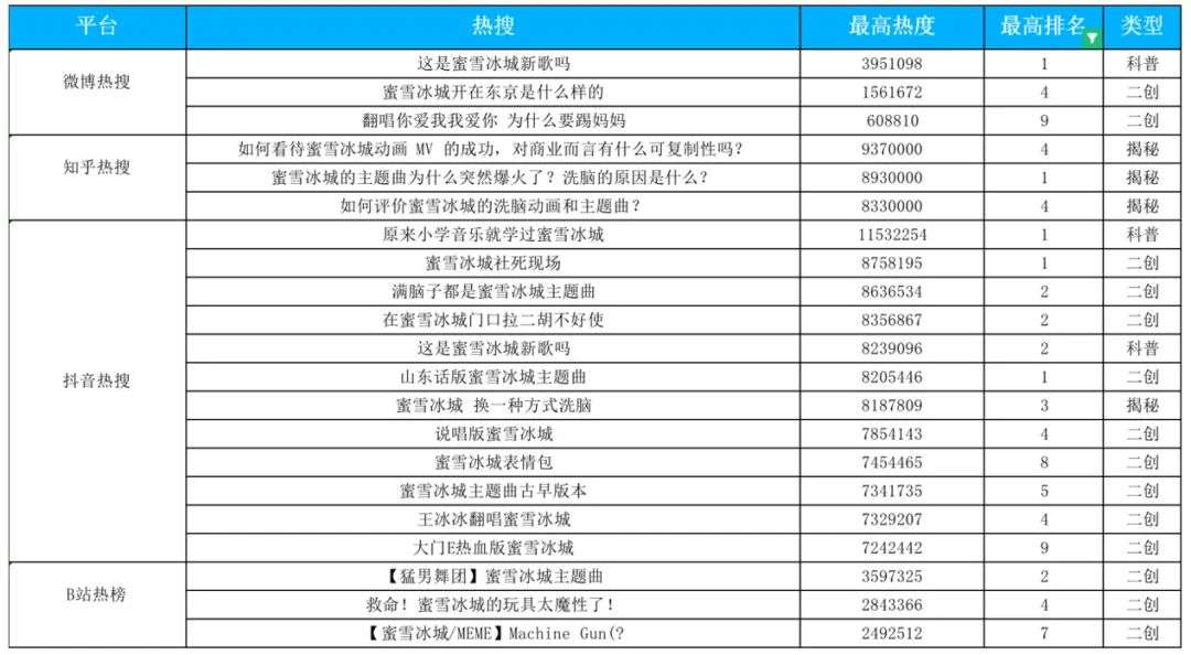 「二创」蜜雪冰城主题曲的相关热搜词条达14个,其中热度最高的当属抖音;对蜜雪冰城主题曲进行「科普」的相关热搜词条共2条,其中微博话题#这是蜜雪冰城新歌吗#登顶微博热搜榜首;以「揭秘」蜜雪冰城背后故事的相关热搜词条共4条,聚集平台主要在知乎。