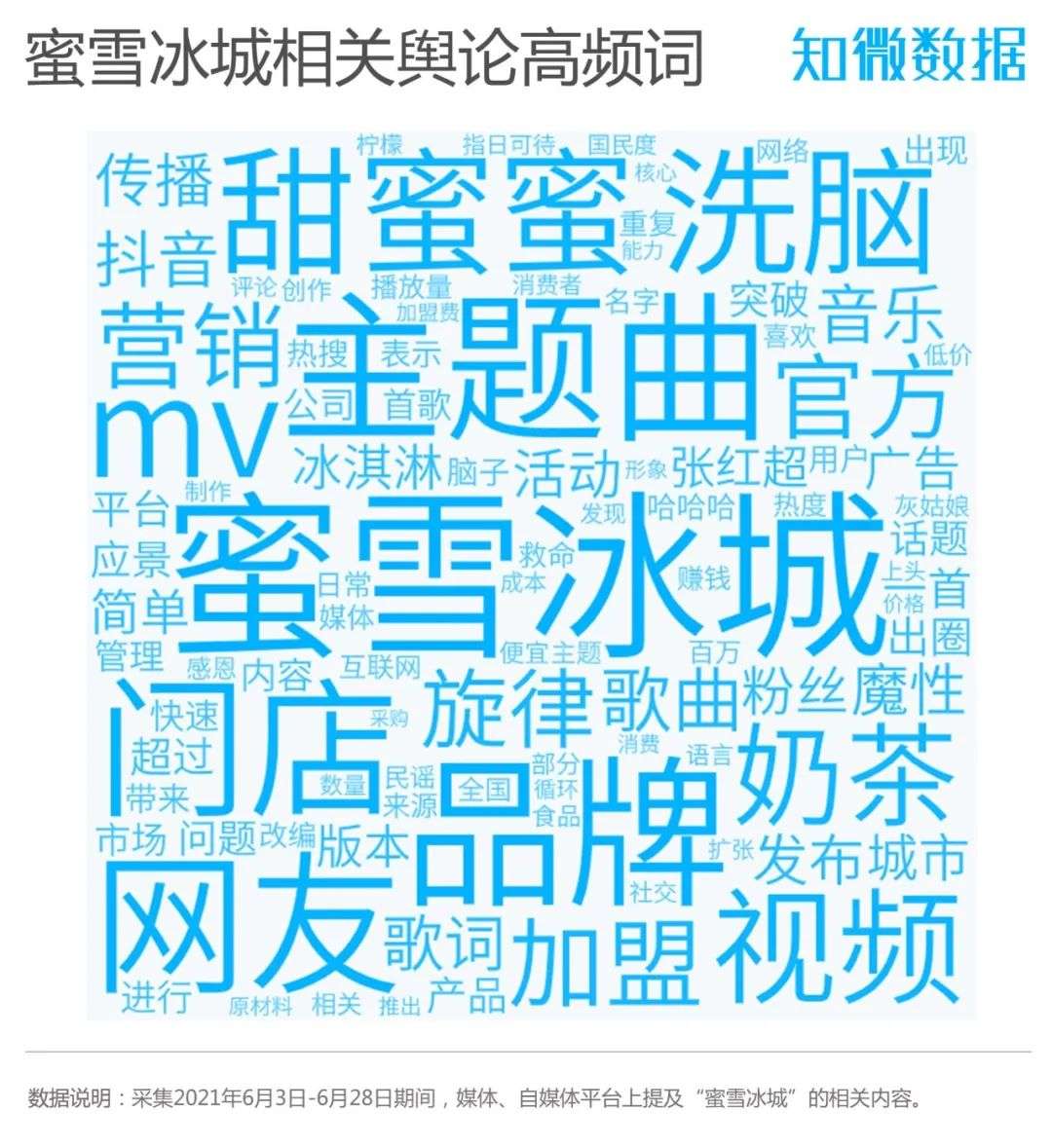 由1号数读联盟-知微数据在网络平台中抓取的关于「蜜雪冰城」的内容高频词中,「蜜雪冰城」和「主题曲」尤为瞩目,而这也恰是蜜雪冰城「尬营销」的新秘籍。