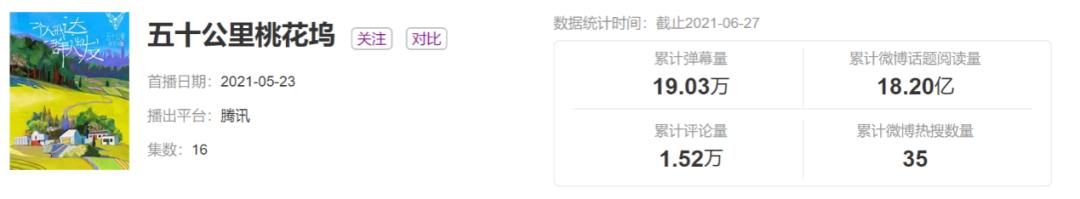 1号数读联盟-艺恩数据显示,截止6月27日综艺《五十公里桃花坞》累计微博话题阅读量已达18.20亿,累计弹幕量达19.03万。