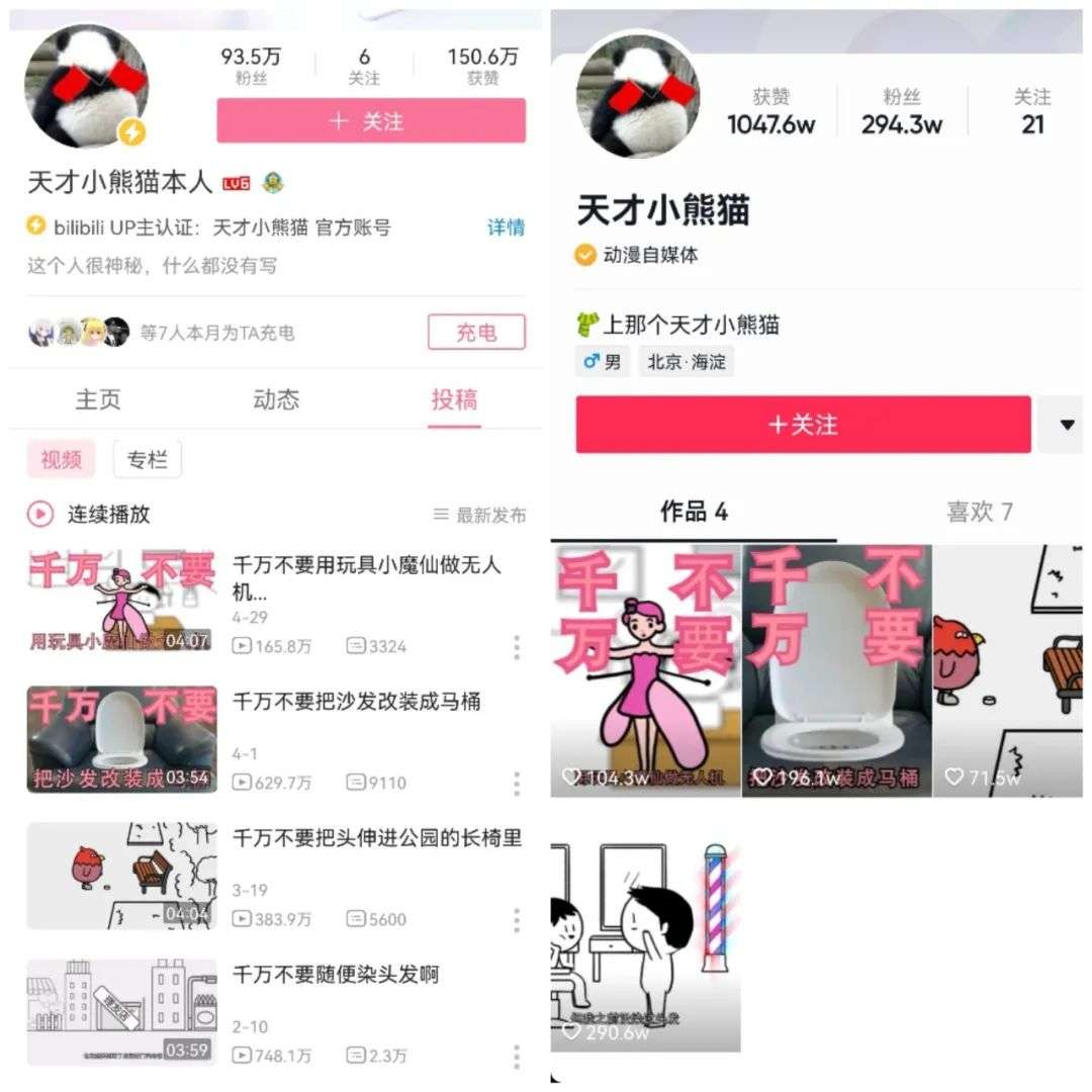 视频博主@天才小熊猫本人发布的4条「千万不要」系列视频,通过讲述自己的社死故事,在B站收获了93.5万的粉丝和单条视频最高播放量达785万的成绩。在他的抖音账号中,同样是这4条视频,就让他收获了294.3万粉丝。