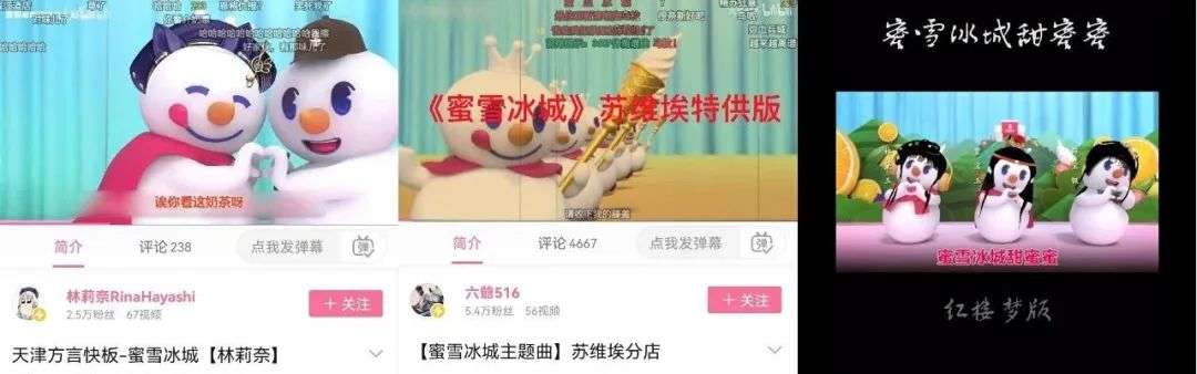 一句贯穿歌曲始终的「你爱我,我爱你,蜜雪冰城甜蜜蜜」配合着熟悉的旋律自然而然降低了受众的记忆成本,也让蜜雪冰城能在短时间内迅速刻进受众的脑海中。而当这样的「尬」遇上B站一群不「尬」不行的UP主时,蜜雪冰城主题曲也实现了从方言版到苏联版,从红楼梦版到恐怖片版的继续扩张。