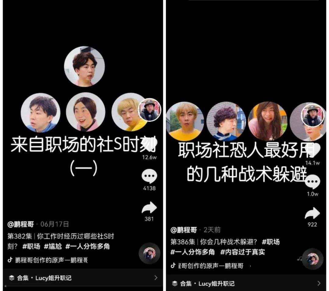 在抖音,诸如鹏程哥、戏精牡丹、老四的快乐生活等短视频博主以短剧形式,展现职场、社交过程里的社死名场面,相继成功出圈。