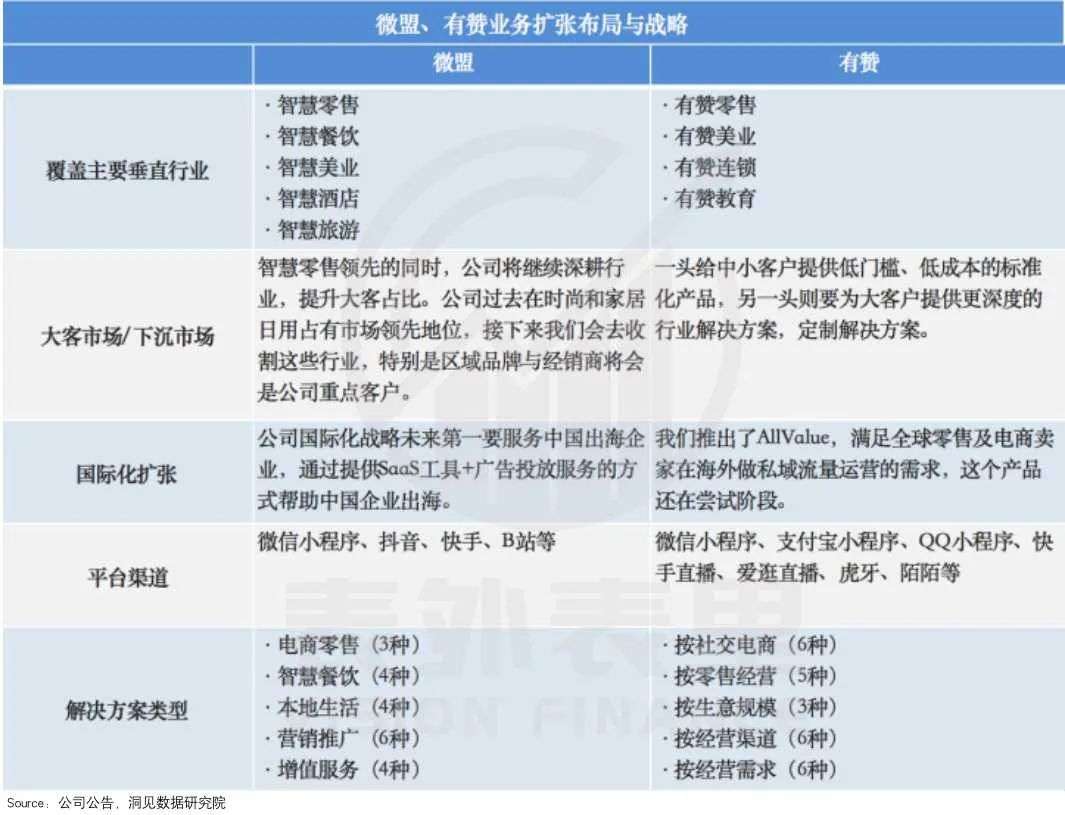 在线下零售方面,从上图的扩张情况看,无论是微盟,还是有赞,都在不断扩大所覆盖的垂直行业。