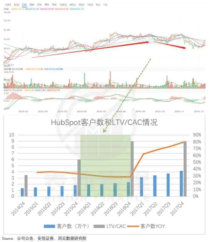 2015-2016年,HubSpot改变产品定价策略和销售激励机制——确定以产品驱动增长,使获客成本降低,LTV/CAC快速提升;但可能由于营销投入有限,HubSpot新客户增速放缓,导致股价出现下滑。