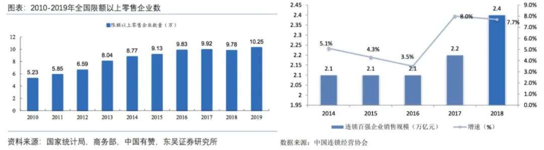 据统计数据显示,2019年全国限额以上零售企业数量达10.2万家,连锁百强企业销售规模达到2.4万亿,极具增长空间。