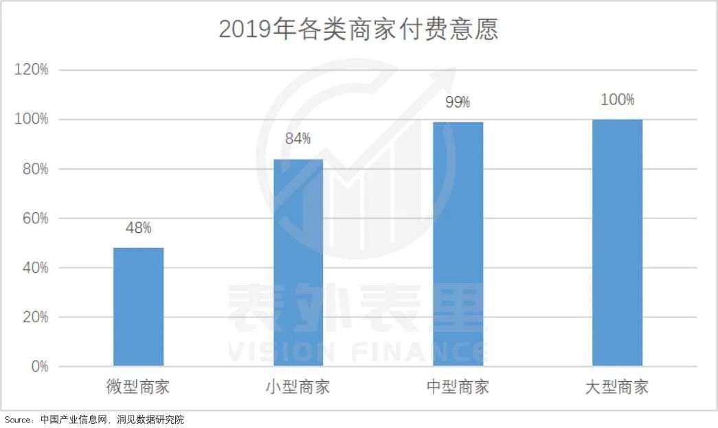 据中国产业信息:2019年大型、中型、小型、微型商家付费意愿分别为 100%、99%、84%、48%。