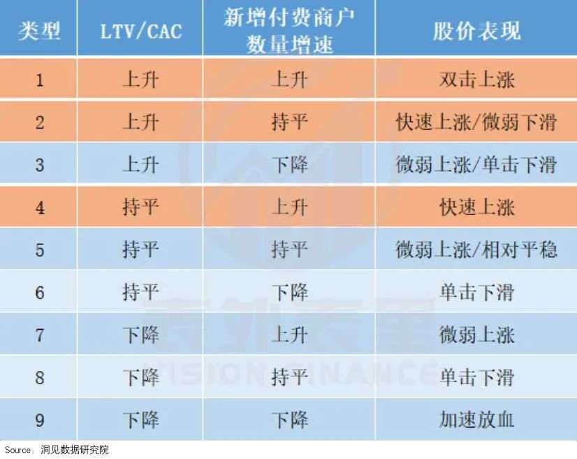 类型4:LTV/CAC持平,企业经营模式的健康程度稳定,新增付费商户数量增速上升,股价能够快速上涨。