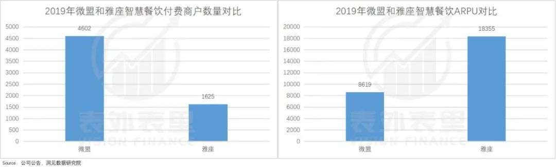 数据显示,2019 年雅座累积付费商户为 1,625 个,远低于微盟,但其ARPU达 1.83 万,是微盟的两倍多。
