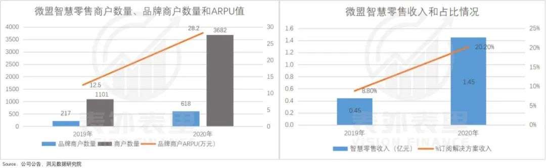 在智慧零售板块,2020年微盟品牌商户(大客户)同比增长184%,达到618家,占比零售总客户数的16.78%;同时,大客户ARPU值也同比增长126%。