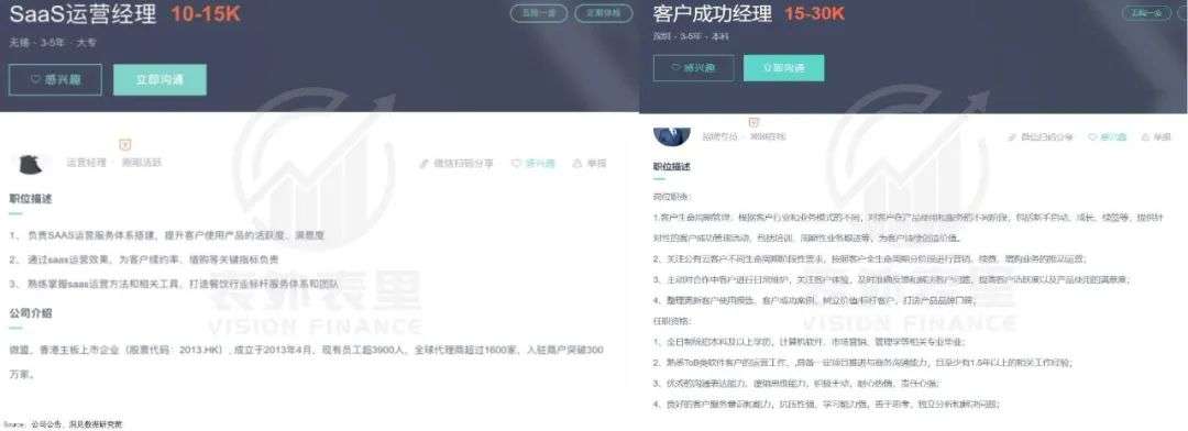 但据表外表里从招聘平台了解的情况,微盟基本上没有客户成功团队的相关招聘,只有“SaaS运营经理”岗位的职位挂出来。