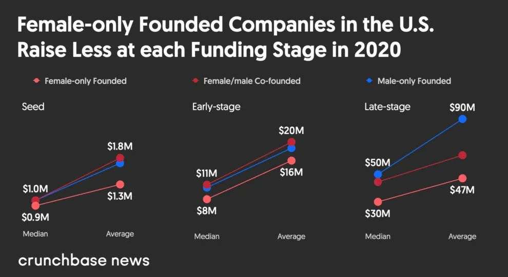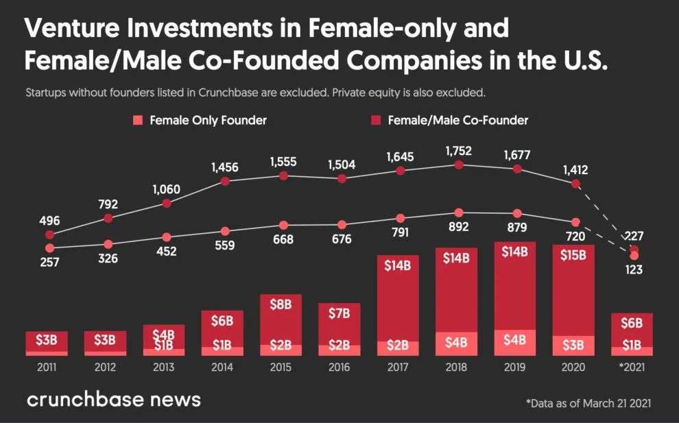 今年女性CEO在财富500强公司榜单中的表现算是十分为巾帼力量长脸,但论资本世界,女性创始人却没有收到同样程度的爱。根据Crunchbase数据显示,全美初创公司在2020年共融资143亿美元,与2019年相比呈现12%的增长,但分给纯女性创始人公司的投资却只有32亿美元,与2019年的42亿美元相比减少了22%。