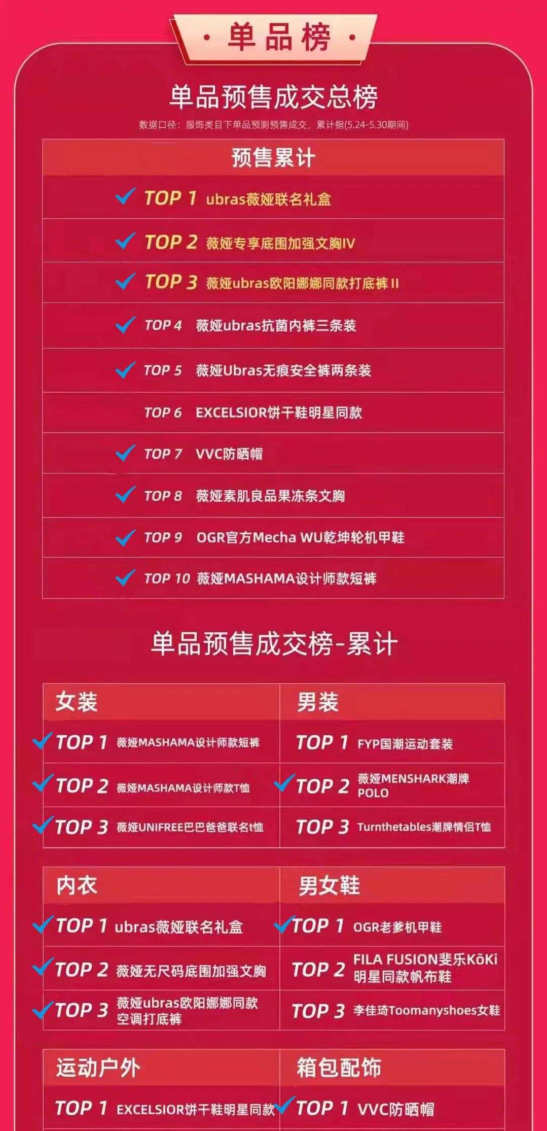 内衣/家居服榜单第一的Ubras在6月15日薇娅直播间;