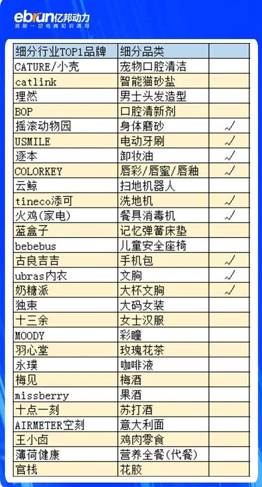 亿邦动力统计了在选取时间节点中上过李佳琦和薇娅直播间的品牌,如下表标出上过的企业。
