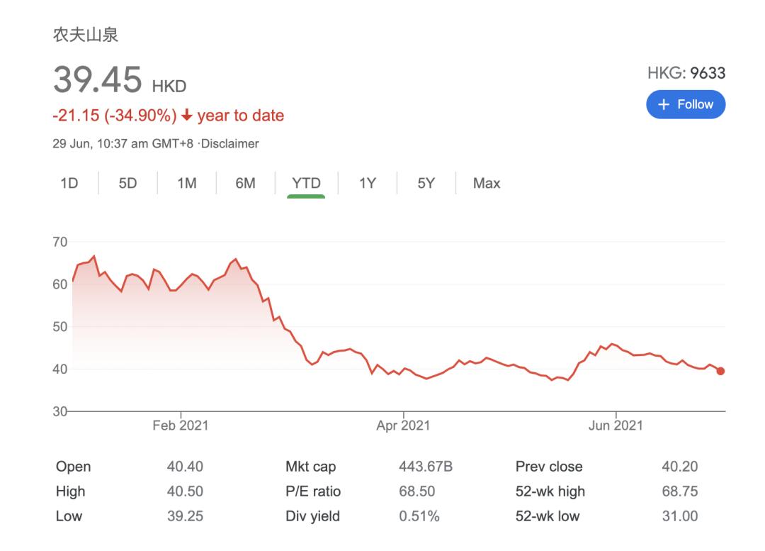 步入2021年,农夫山泉股价持续下跌。相较今年1月8日创下的最高点67.75港元/股,农夫山泉股价已下跌40.4%,市值蒸发超过3100亿港元(约合人民币2578亿元)。