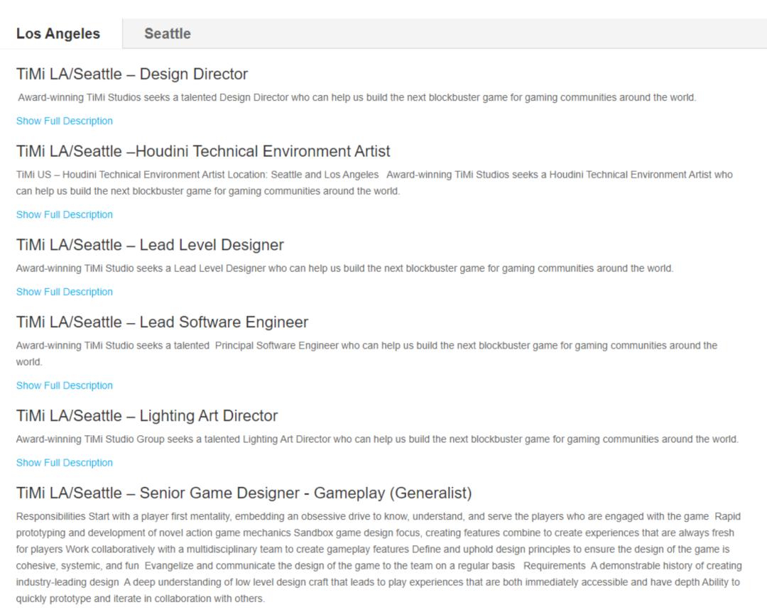 天美LA/Seattle工作室部分岗位一览