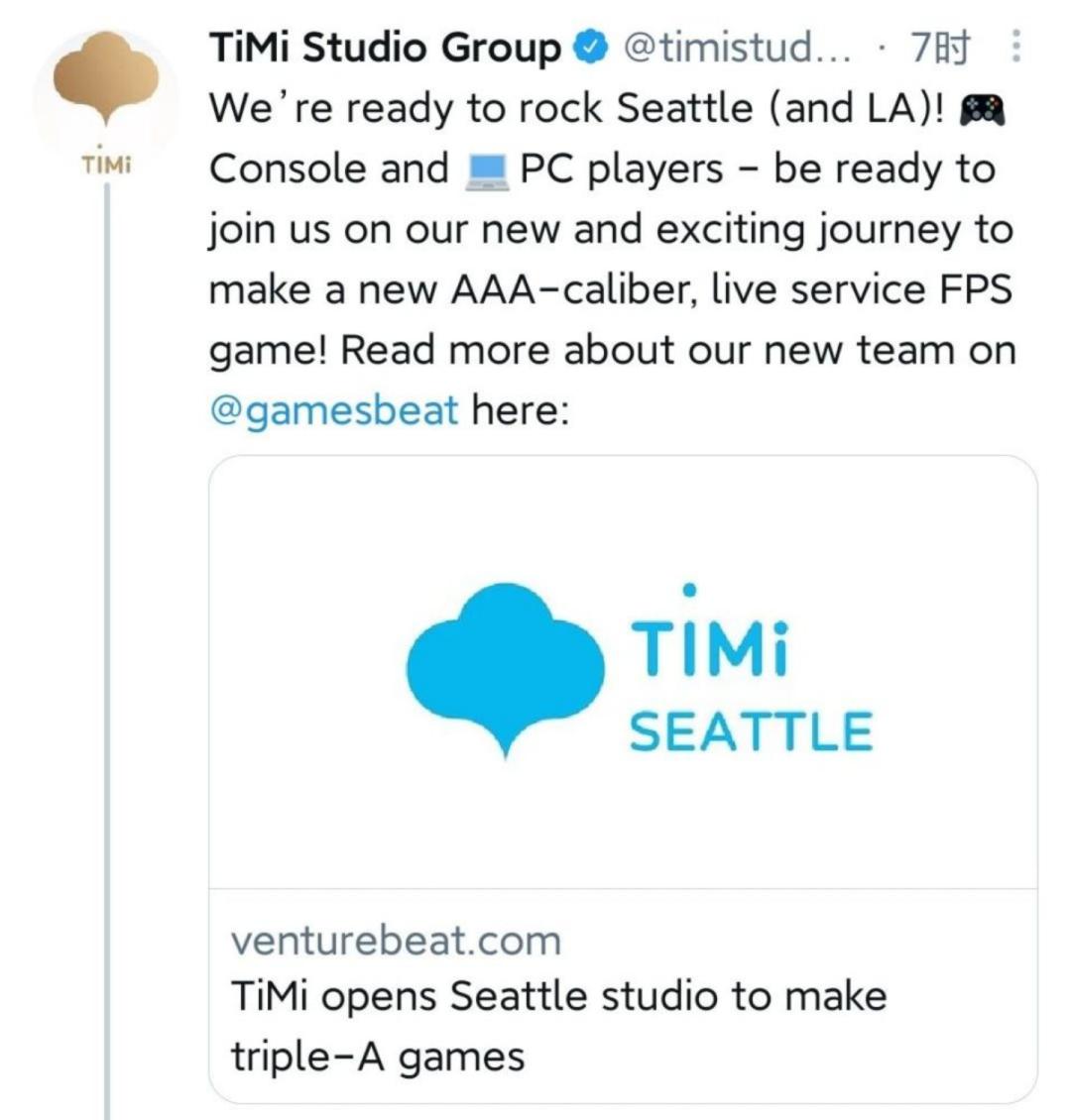 几天前,腾讯天美工作室通过官方推特宣布:在美国西雅图成立了工作室TiMi Seattle,是继洛杉矶的TiMi Los Angeles之后的又一北美工作室。