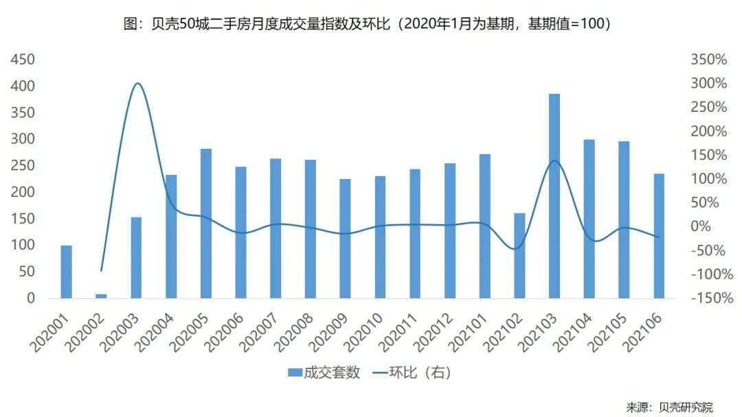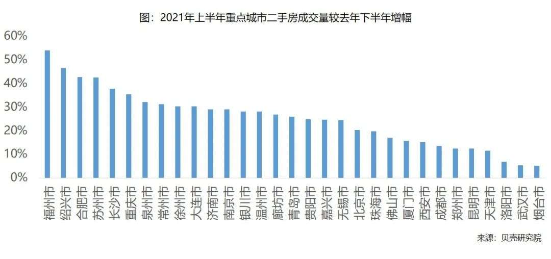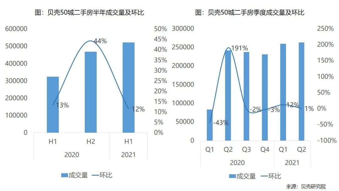 根据贝壳研究院监测,2021年上半年重点50城[1]二手房整体成交量同比增长约六成,较去年下半年增长12%。上半年重点50城二手房交易额(GMV)同比增长约65%,较去年下半年增长约14%。
