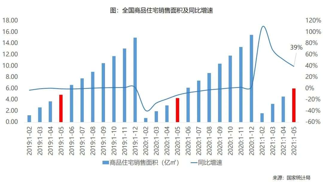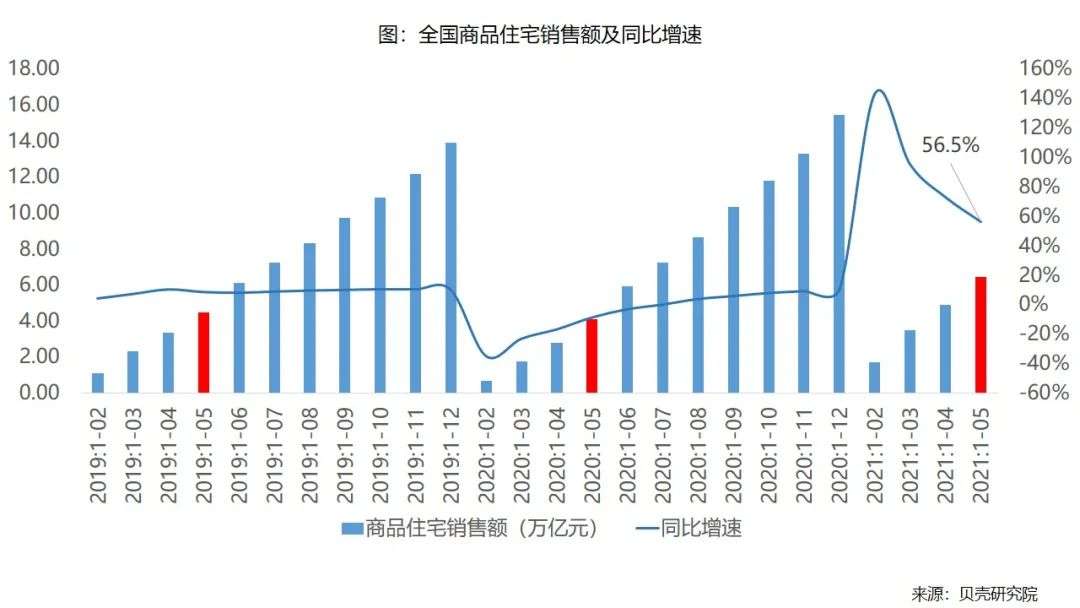 新房市场销售规模增长速度超过二手房。根据国家统计局数据,2021年1-5月全国商品住宅销售面积、销售额(GMV)分别为5.97亿㎡、6.46万亿元,同比分别增长39.0%、56.5%(去年同期基数较低),比2019年同期分别增长22.6%、43.4%,绝对规模均为2016年以来历史同期最高。