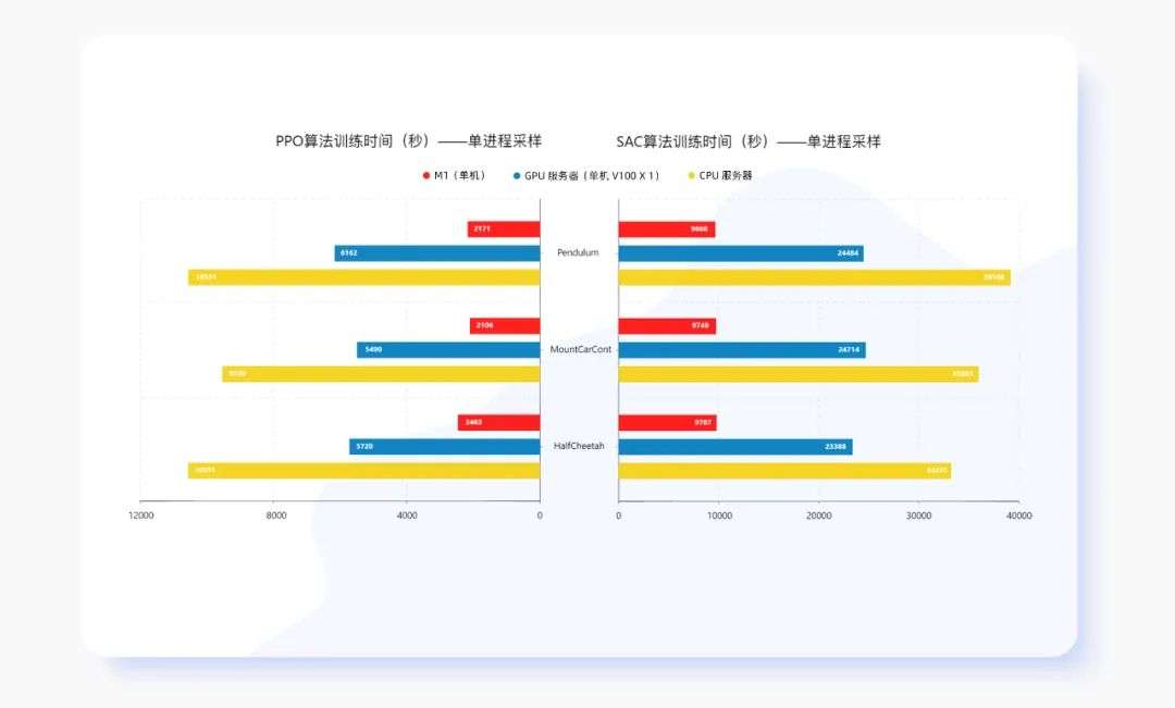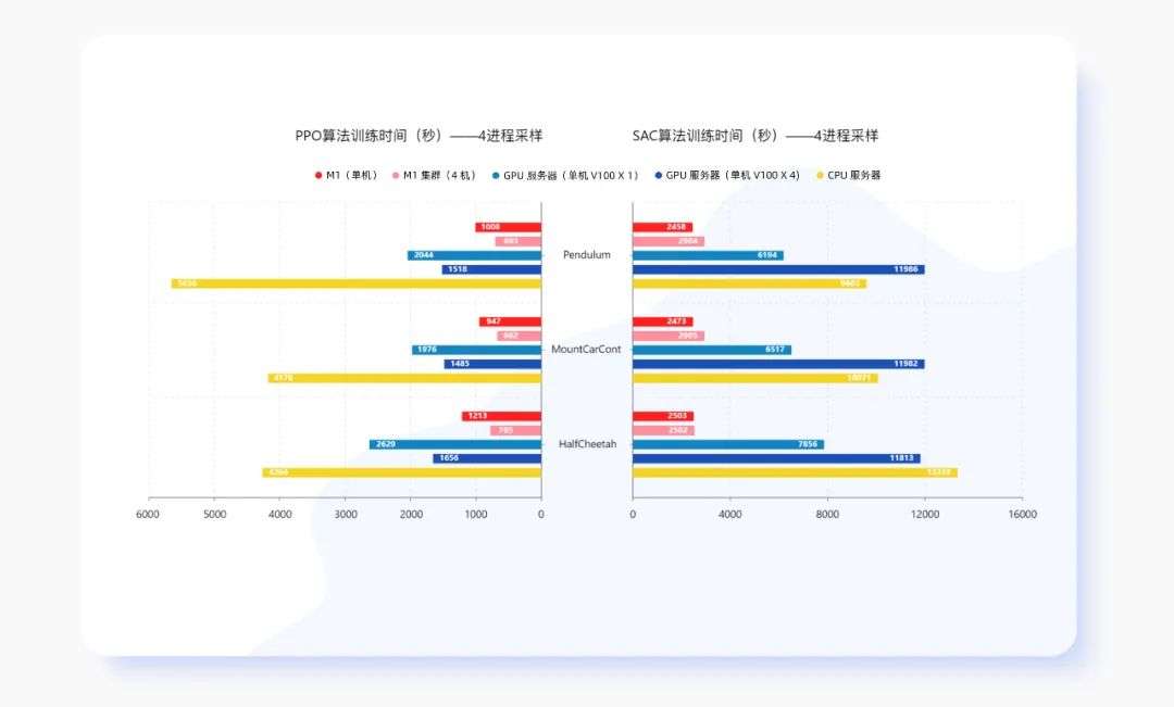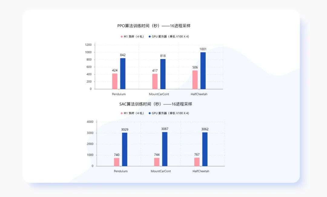 南栖仙策(南京大学人工智能创新研究院技术孵化企业)算法小组用 M1 芯片设备组建小型服务器集群,并与基于 NVIDIA GPU 的传统服务器进行性能对比测试,结果表明,强化学习的训练效率可以得到显著提升。