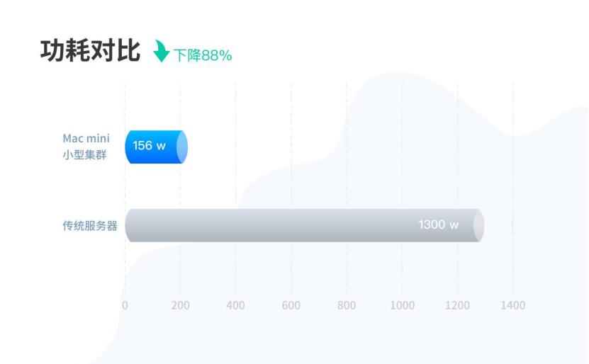注:单个 Mac mini 功耗 39w,4 台总计 156w(瓦),传统服务器约为 1300w(瓦)。