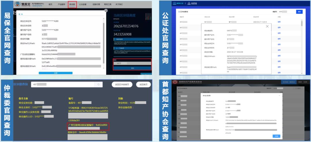 用户通过易保全、公证处、仲裁委、首都知产协会等平台官网,输入确权证书上的备案号,即可查询储存在区块链上的相关确权信息,有效保障用户信息不可篡改、时间不可篡改、电子数据不可篡改,确保全流程可溯源,全数据可核验,全链路可信举证。