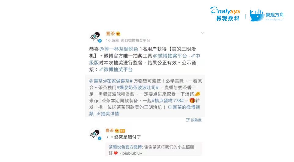 各个品牌之间还会展开互动,谁能不好奇喜茶这次又错付给哪个对手了呢?增加话题度的同时,也会吸引其他饮品的消费者转向自家。