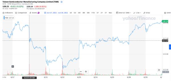 芯东西6月30日报道,台积电股价自18日起一路下跌,21日更是低开低走,单日市值蒸发近5000亿新台币(大约1000亿人民币),22日触6月股价最低点112.62美元,与同期国内芯片市场的火爆形成鲜明对比。