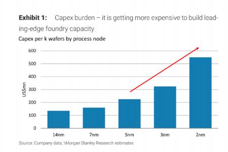 ▲台积电不同芯片工艺的投资成本(芯片工艺/投资成本)