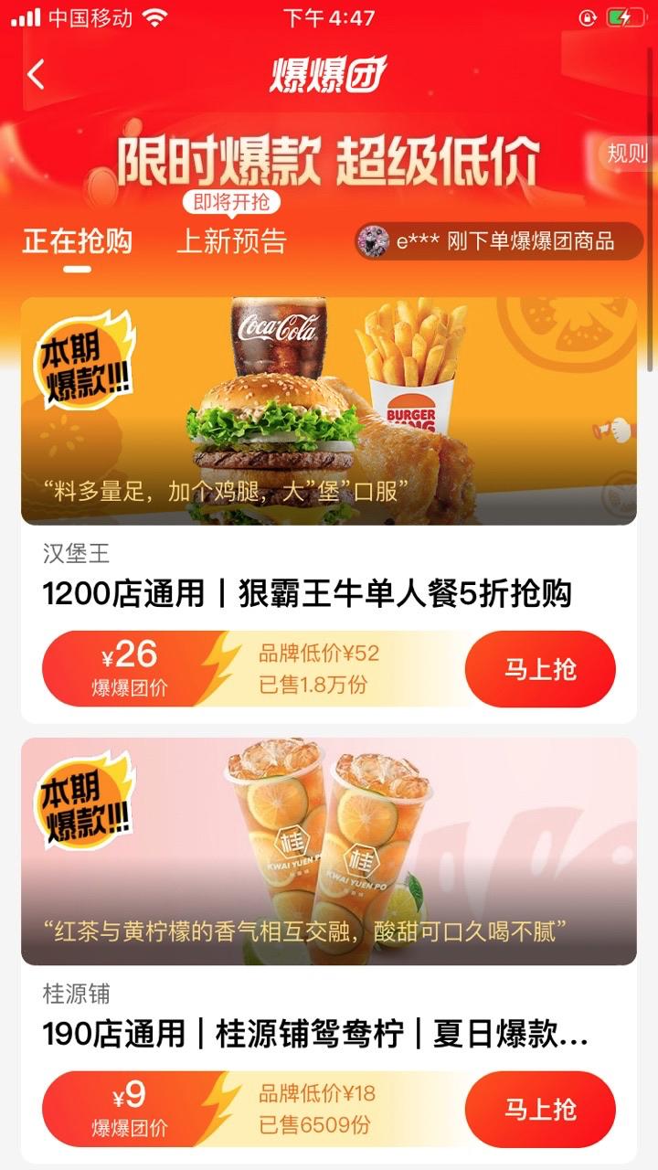 聚划算是阿里用低价正品打开下沉市场的一把利器,展示的都是提供折扣的大牌商品。爆爆团也类似,支付宝APP内口碑的第一屏、饿了么的第二屏,都有专门入口,页面基于LBS地理位置展现附近的10-20件商品,强调的是套餐名、价格与折扣——将大众熟知的餐饮品牌卖出1-6折的价格,譬如5折汉堡王的套餐、Godiva冰激凌、9.9元抵100元的谭鸭血代金券等。