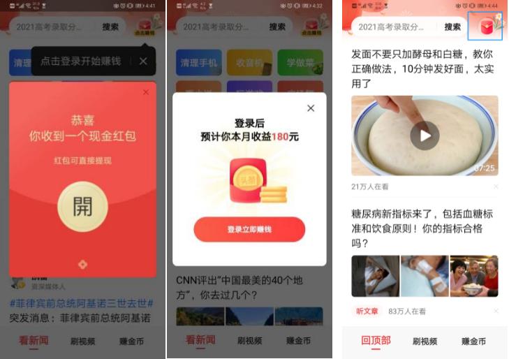今日头条与抖音同属于字节系,两个平台的内容属性、推荐原理具有极大的相似性。今日头条大字版已经上线,光子星球使用后发现,打开APP首先跳出来的是一个待开的红包,一时间误以为自己进了拼多多,继续操作发现,平台是想通过红包引导用户注册登录,玩着刷内容赚钱的老套路。