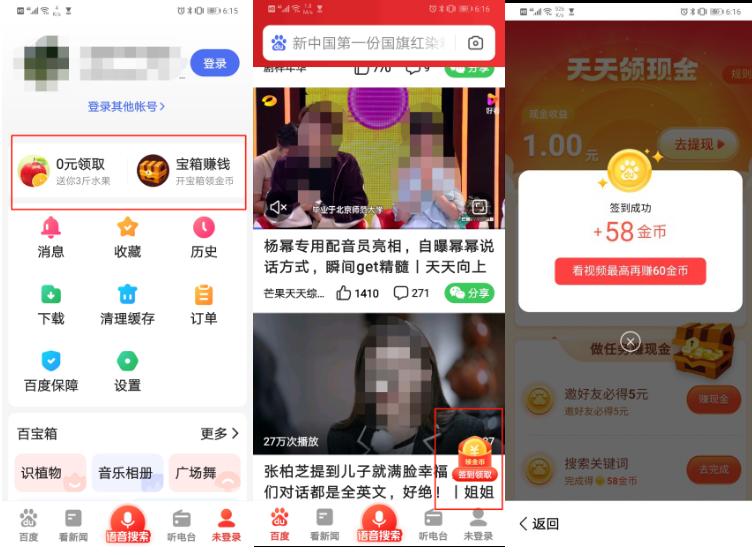 另外,百度作为搜索工具,也在有意“留住”老年用户,简化页面后着重突出了看新闻、听电台、以及搜索等功能。同时还添加了0元领水果、签到领金币等小游戏,以此增加用户活跃度和使用时长。