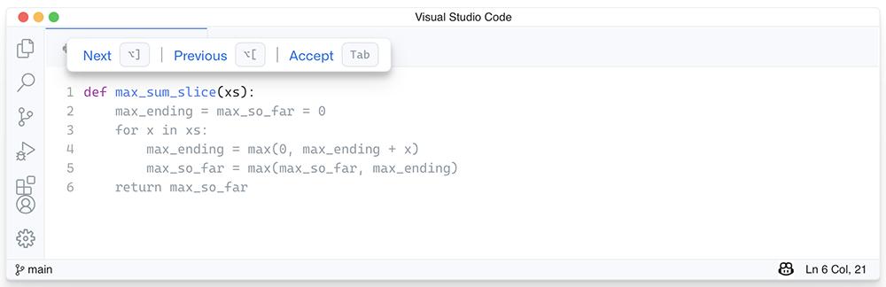 GitHub Copilot从开发者已经编写的代码和注释中提取上下文,试图理解开发者意图,生成需要添加的一行、多行代码或整个函数,当程序员接受或拒绝建议时,模型就会学习越来越适应和匹配开发者的编程风格。