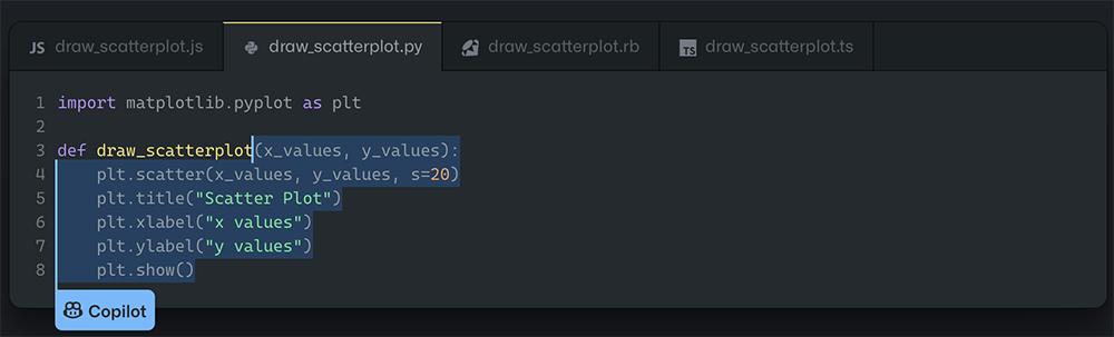 ▲GitHub Copilot自动补全绘制散点图代码