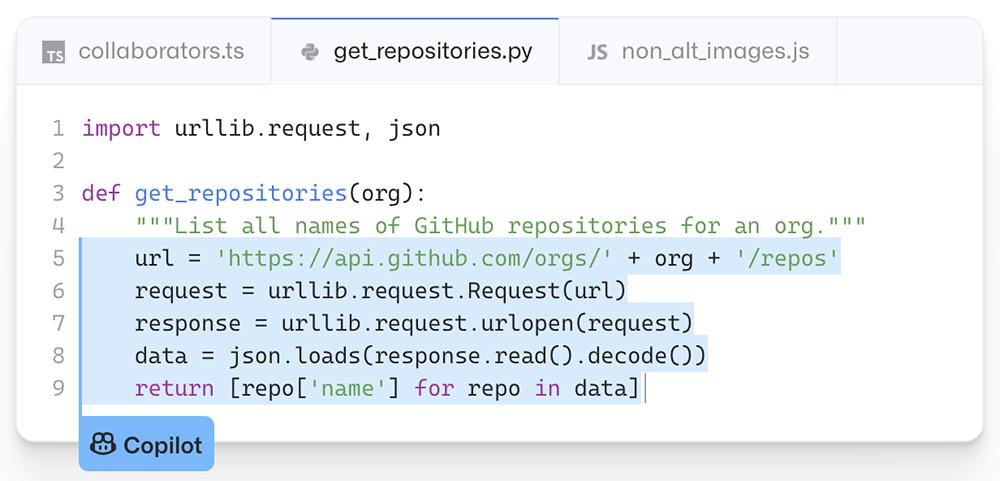 GitHub Copilot比大多数代码助手能更好地理解上下文。无论是文档字符串、注释、函数名,还是代码本身,GitHub Copilot可以根据上下文合成代码来匹配。