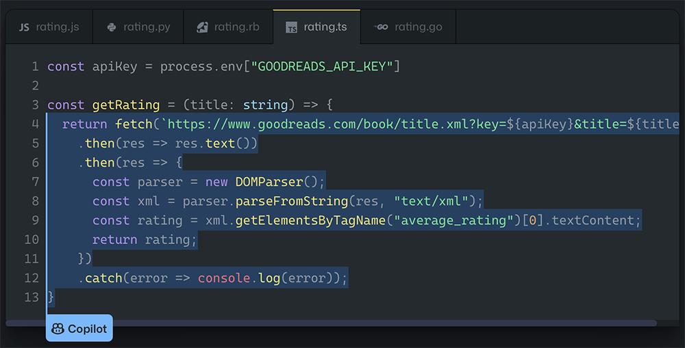 ▲GitHub Copilot自动补全抓取书评网站Goodreads评分的代码