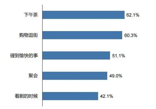 但是「一杯好茶一口软欧包」,就足够打造社交场景吗?据沙利文 2020 新茶饮行业发展白皮书,下午茶、购物和遇到愉快的事是新茶饮消费的三大主要场景。不同于咖啡,奶茶的社交属性并没有这么突出,目前也没有真正适合办公的奶茶店。奶茶依旧是一种休闲的、伴随式的个人饮品,边走边喝、公司办公喝、在家喝的场景更为常见。