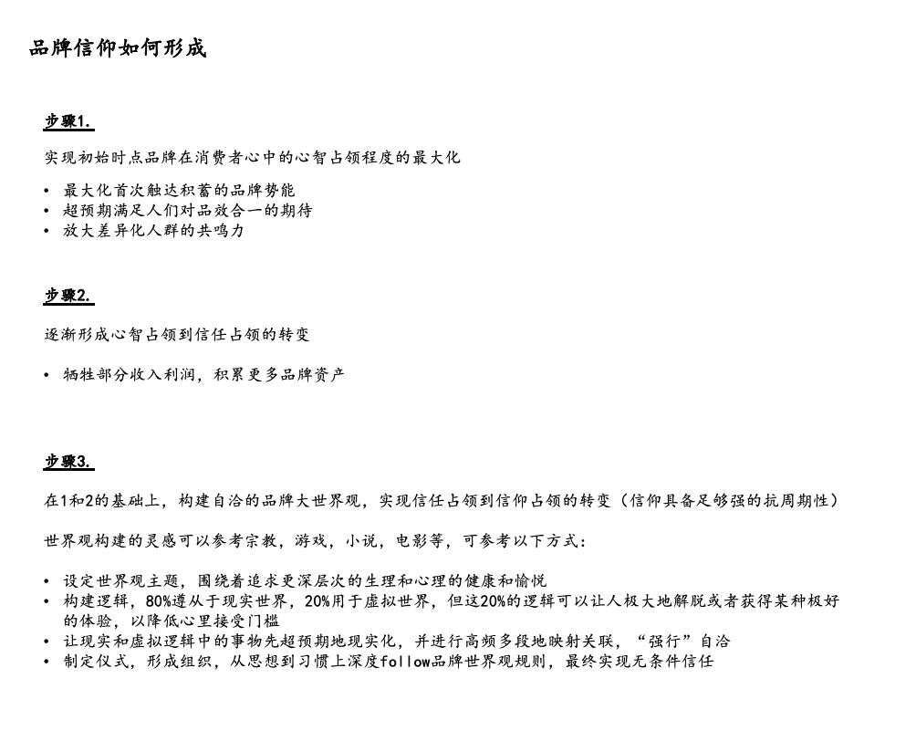 第四个就是形成从思想和习惯上深度follow品牌的世界观规则,最后实现无条件的信任。