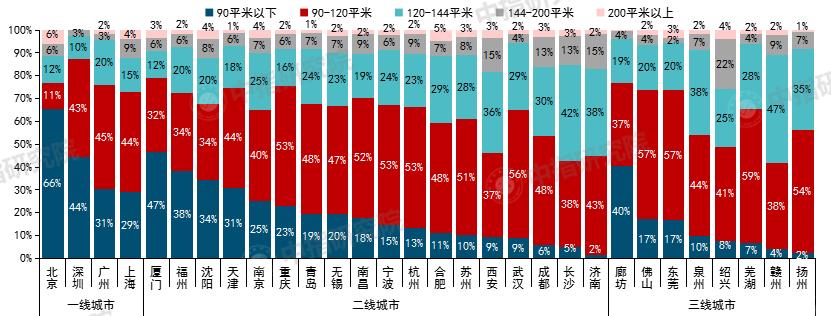 ▍需求结构:多数城市套总价均值和中位数继续上涨,90-120平米占比普遍提升,90平米以下占比有所回落
