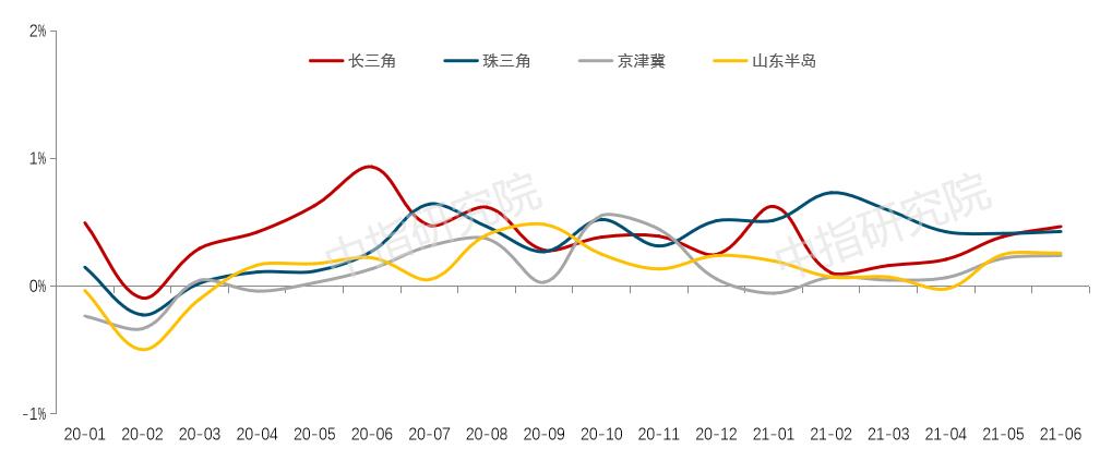 百城新建住宅市场整体较为平稳,价格累计涨幅较去年同期有所扩大,但涨幅仍处近年同期较低水平。根据中房指数系统百城价格指数,2021年6月,百城新建住宅均价16063元/平方米,同比上涨3.89%,涨幅较上月收窄0.19个百分点;环比上涨0.36%,涨幅连续48个月在0.6%以内,整体维持在低位区间。累计来看,2021上半年百城新建住宅价格累计涨幅较去年同期扩大0.43个百分点至1.70%。