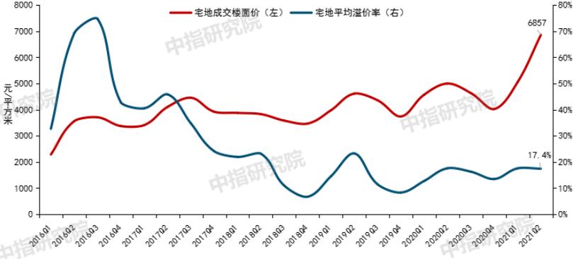 住宅用地成交楼面均价创历史新高,溢价率保持高位。2021年上半年,全国300城住宅用地成交楼面均价为6170元/平方米,同比上涨26.7%;平均溢价率为17.5%,较去年同期提高1.3个百分点。优质地块供应量增多,土地市场升温,仍是支撑楼面价大幅上涨、溢价率提升的重要因素。