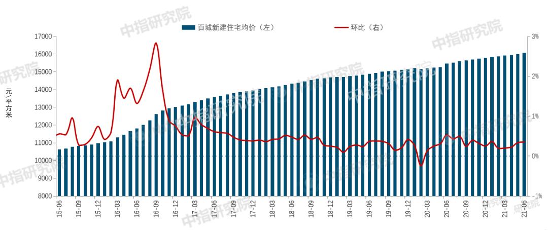 图:2015年6月至2021年6月百城新建住宅均价及环比变化