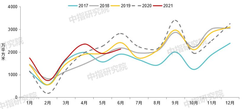 上半年重点城市商品住宅成交保持一定活跃度,整体规模达近五年同期最高水平,居历史同期次高位。据中指数据初步统计,2021年上半年,50个代表城市商品住宅月均成交面积约3580万平方米,达近五年最高,在历史同期中仅低于2016年上半年,在去年同期低基数影响下,同比增长40.8%,与2019年同期相比,增幅在两成以上。