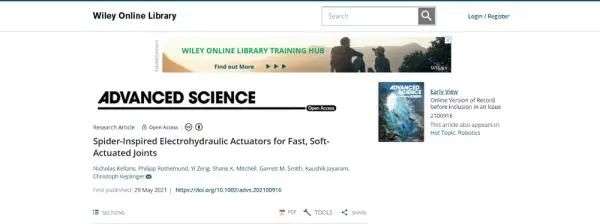 该研究论文题目为《受蜘蛛启发的,可用于快速驱动柔软关节的电动液压驱动器(Spider-Inspired Electrohydraulic Actuators for Fast,Soft-Actuated Joints)》,于近日发表在《Advanced Science》上。