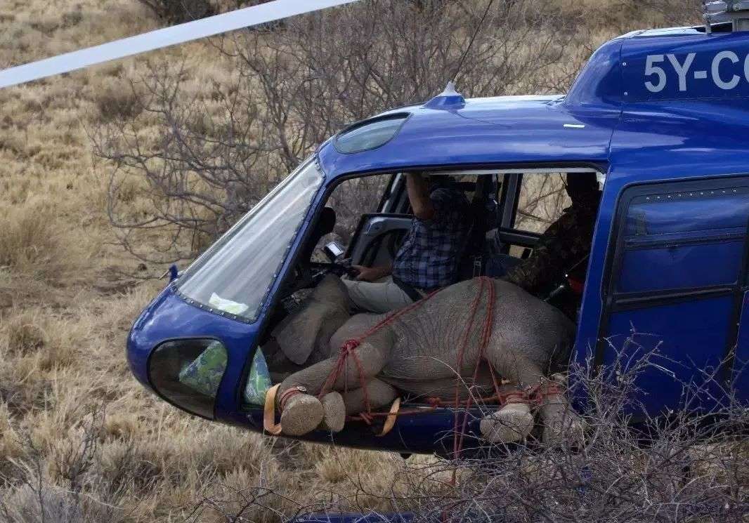 差不多下午四点,直升机、兽医和大批工作人员到达现场,直升机和地面人员配合搜索了近一个小时后确定了乳象的位置,1岁半的小象被麻醉针射中,500公斤的小家伙被斜着弄进了飞机。当人们正议论几条腿还在门外时,酷酷的驾驶员发话了,都给我起开。然后飞机就在众人惊讶的眼神中飞走了,以向左边微倾的姿态飞向几十公里外的大象孤儿院。