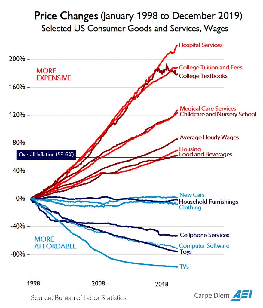 住房、教育和医疗保健,这些议题每一个都非常复杂,但它们的共同点是价格飞涨,而且背景是技术已经压低了大多数其他产品和服务的价格。(见下图。)我认为我们应该在下一个十年建设出打破这些价格曲线的新技术、新企业以及新行业——其实是要逆转它们,并让实现美国梦的这三个主要标志对普通人来说变得越来越容易。我很自豪我的风险投资公司在所有三个领域都有令人兴奋的创业投资,但我们还有很多工作要做。我希望更多的人加入我们的使命。