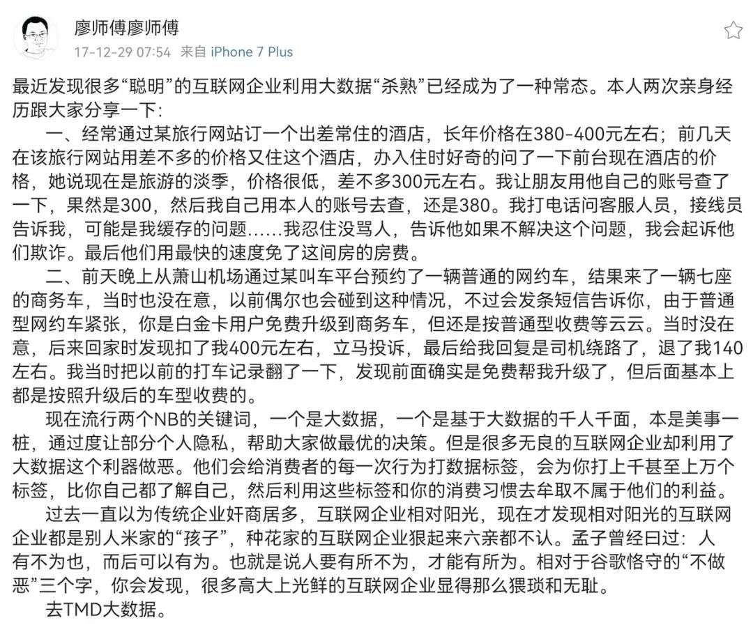 在中国,大数据杀熟引发社会关注的时间实际上比较晚。 2017年底,微博用户@廖师傅廖师傅发帖称,自己被某在线旅游平台和某网约车平台大数据杀熟。 @廖师傅廖师傅是中国目前可以查到的曝光大数据杀熟的第一人,但在当时并没有引起媒体的广泛关注。