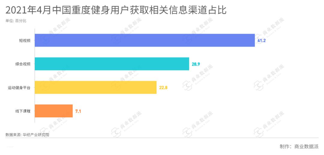 华经产业研究院数据显示,2021年4月,国内共有41.2%的重度健身用户是通过短视频平台来获取运动健身相关信息,而运动健身平台占比22.8%,线下课程仅占比7.1%。